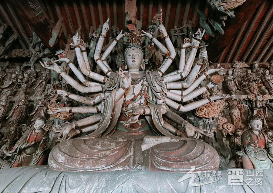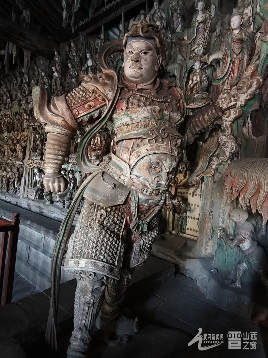 寺內(nèi)擁有總計(jì)2000多尊彩塑,大者丈余、小者尺許,每一壁龕為一獨(dú)立神話或佛教故事,人物造型生動(dòng),神態(tài)逼真,尤其以“千手觀音像”與“韋馱像”最為經(jīng)典。舞蹈《千手觀音》的靈感原型就是這尊千手觀音像。塑像高達(dá)數(shù)米,全身貼金,背后伸出上千只手臂,每只手掌上都有一只眼睛,錯(cuò)落有致,整個(gè)造像氣勢(shì)恢宏,達(dá)到雕塑藝術(shù)中和諧、完美的境界。韋馱像巍然肅立,身披甲胄,神情凝重,整個(gè)身體呈現(xiàn)出一種微妙的動(dòng)態(tài)平衡,是明代彩塑中少見的藝術(shù)杰作,被譽(yù)為“天下第一韋馱”“全國(guó)韋馱之冠”。景區(qū)講解員侯麗娟介紹:“這尊塑像的高明之處就在于匠師不落俗套,打破了一般程式的限制,賦予了韋馱一種時(shí)間的節(jié)奏性和動(dòng)作的連續(xù)性,產(chǎn)生了雕塑作品的最高境界‘不動(dòng)之動(dòng)’?!?/p>
